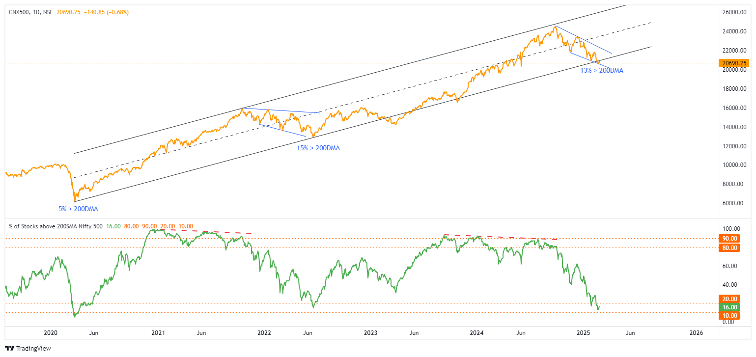 Below is the chart of Nifty 500 (going broad) and using the diffusion indicator (again courtesy strike), at tops it shows long divergences; whereas at bottoms its either small divergences or v shaped recovery. The important aspect here is that this indicator shows that only 13% of the Nifty 500 constituents are above 200 DMA, compared to 15% at wave (2) low and 5% at covid bottom. Sentiment is indeed poor and if Nifty 500 manages to come back in the channel, then the bottom should be in.