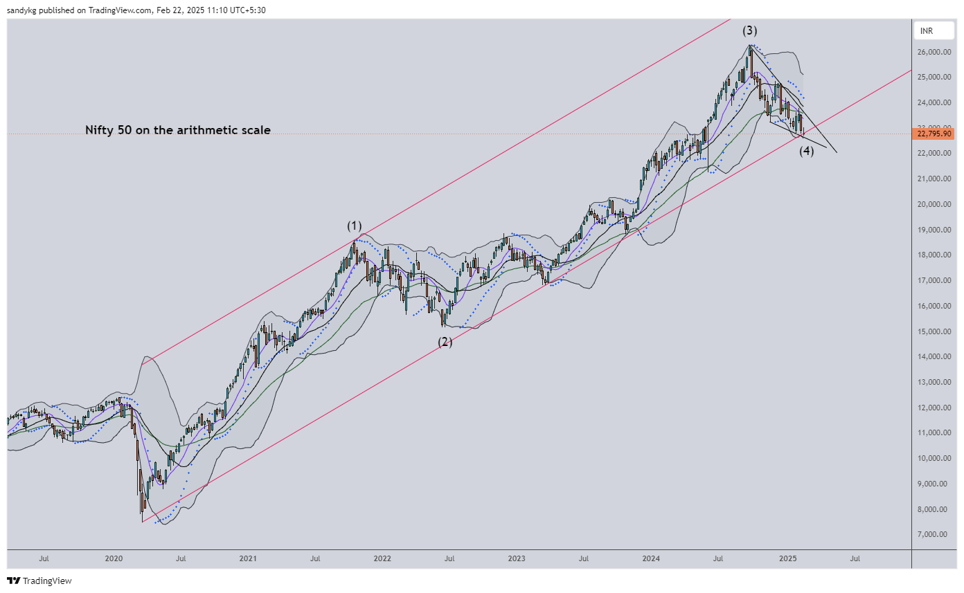 Nifty from the bottom of 2020, seems to depict 3 waves up, with the 4th wave close to culminating at the channel line from the orthodox low (where sentiment was lower than the 15200 bottom.