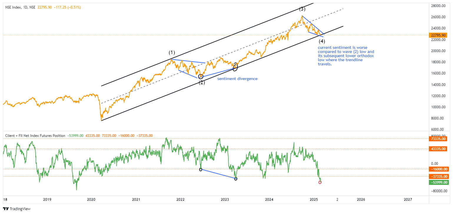 Before we move on to the wave counts, lets look at sentiment (courtesy: web.strike.money), first we will look at Client+FII Net Index Position which is at its lowest reading from the lows of the pandemic. Also as you would see the sentiment at 16,800 the orthodox low (channel) is lower than the actual low of 15,200. So if wave (5) becomes bigger than (3), the low in sentiment could be evidence for a wave count change to wave 2 of Wave (3) [basically a wave (3) subdivision].