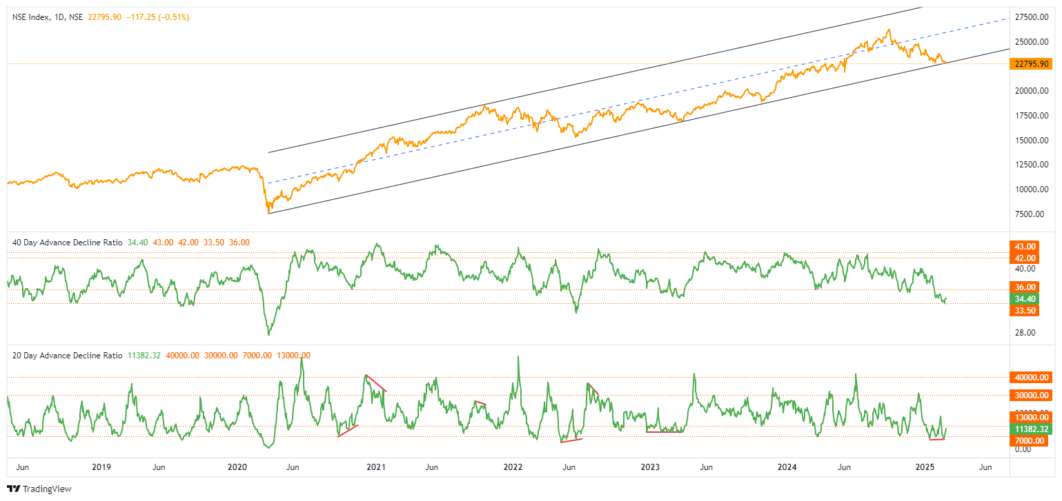 Now lets look at the AD Ratio, here they depict extreme negativity – however AD40 still has room to drop (although not necessary). However what is interesting is that on many occasions AD20 shows a divergence with AD40 before trend reversal in the underlying index. Currently, not ideal but AD20 shows a flattish line and AD40 drop quite a bit.