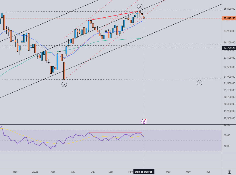 This week is important for Nifty, if it breaks 25690 decisively (on a weekly basis), it would have closed 3 weeks down breaking an important gap up area formed on 11th November 2025 and a weak channel as wave (b) – shown in below chart.